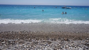 Apoi, daca te dor picioarele si vrei sa te odihnesti putin, ia o pauza si aseaza-te pe malul Marii Mediterane care este un turcoaz fermecator. Plaja din Nisa este complet diferita de toate celelalte pe care le-am intalnit pana acum. In loc de nisip, aici vei gasi pietre. Pe plaja n-o sa auzi muzica, n-o sa vezi vanzatori ambulanti tipand sa-ti vanda porumb si nici oameni jucand fotbal. Am stat 2 ore nemiscata pe prosop si chiar nu m-am plictisit. Este o adevarata placere sa privesti marea si muntii in acelasi timp. <3
